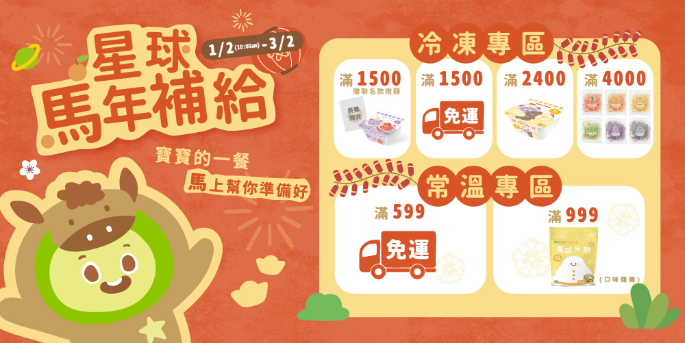 至2026-03-02T16:00:00.000+00:00截止 全店,星球馬年補給|滿$4000贈寶寶烏龍麵6入(口味隨機)