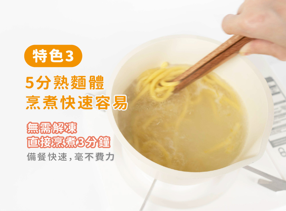 ✔無需解凍,半熟麵體直接烹煮,3分鐘輕鬆上桌