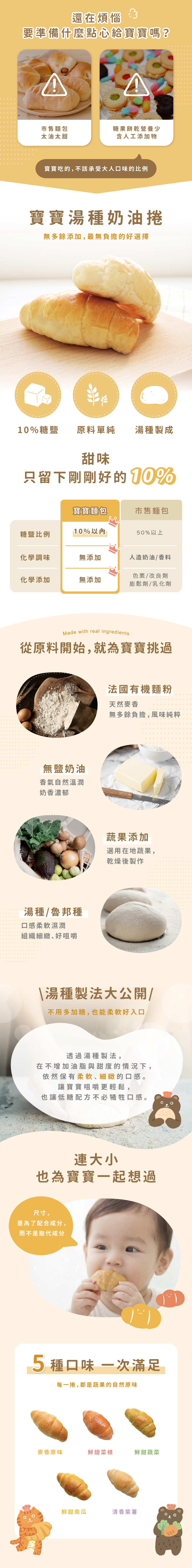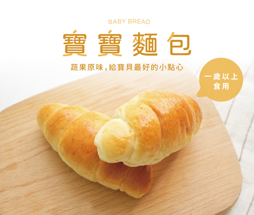 A:寶寶麵包採減糖減鹽設計,口味清淡不厚重,讓寶寶能逐步適應調味,是從副食品過渡到一般麵包的安心第一步!