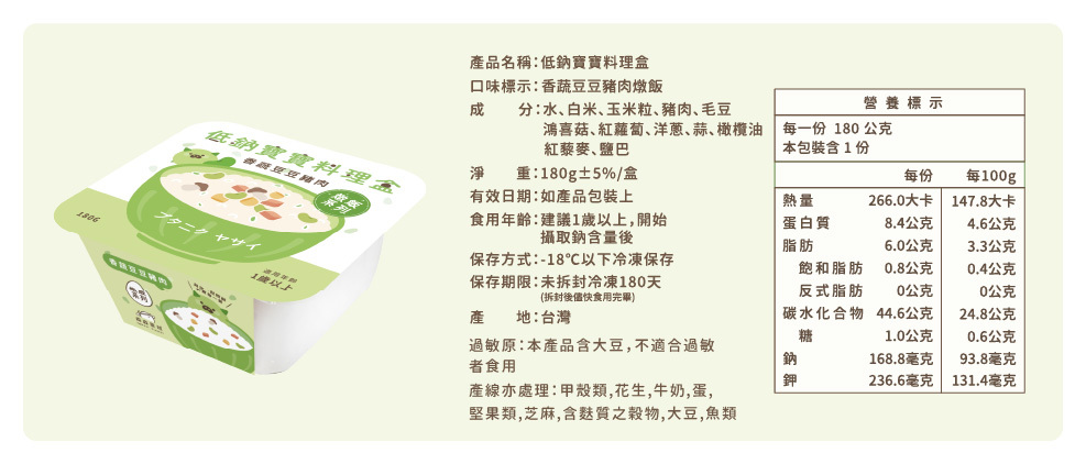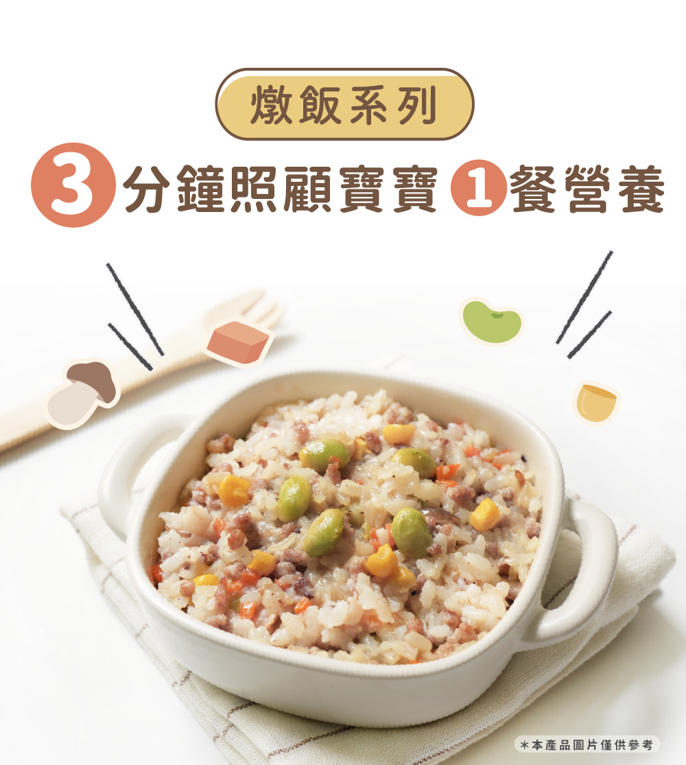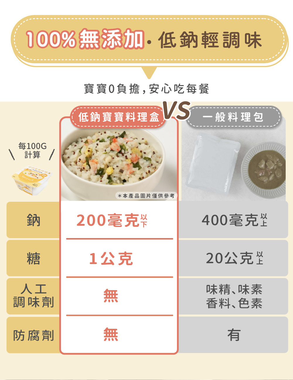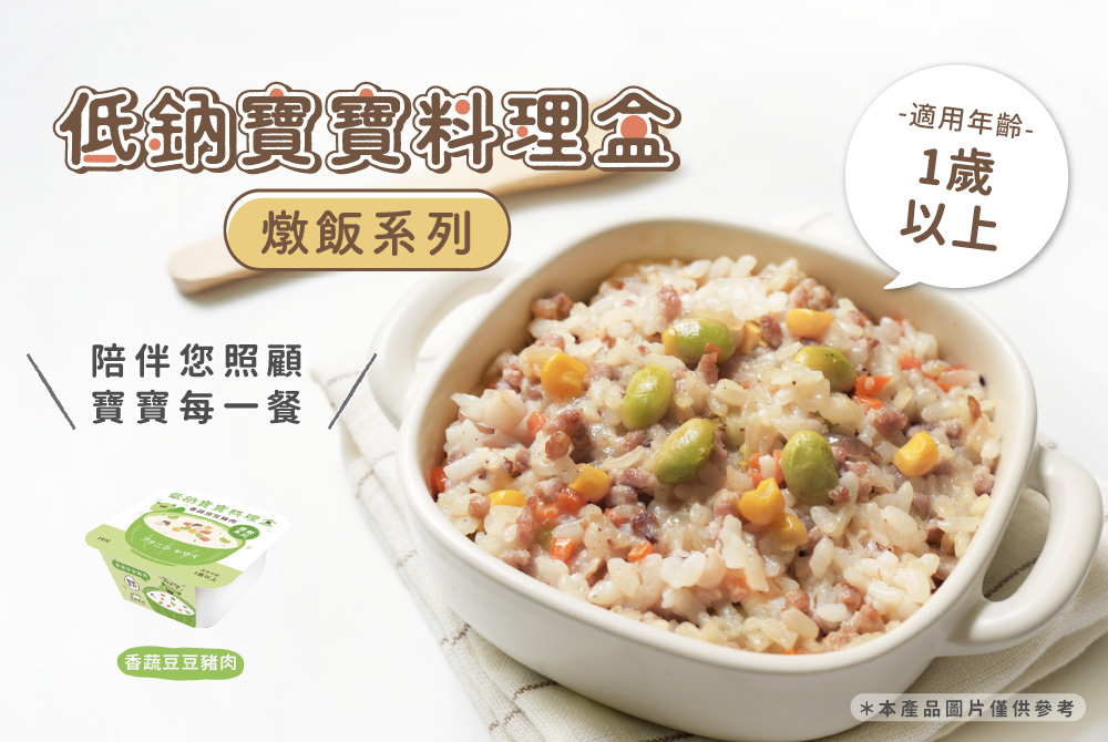低鈉寶寶料理盒(寶寶燉飯系列)主打低鈉輕調味、零化學添加,嚴選5種天然食材製作,3分鐘微波加熱即可快速上桌。