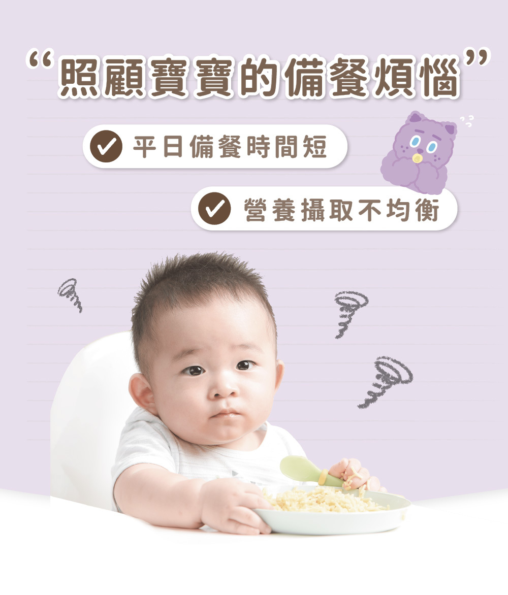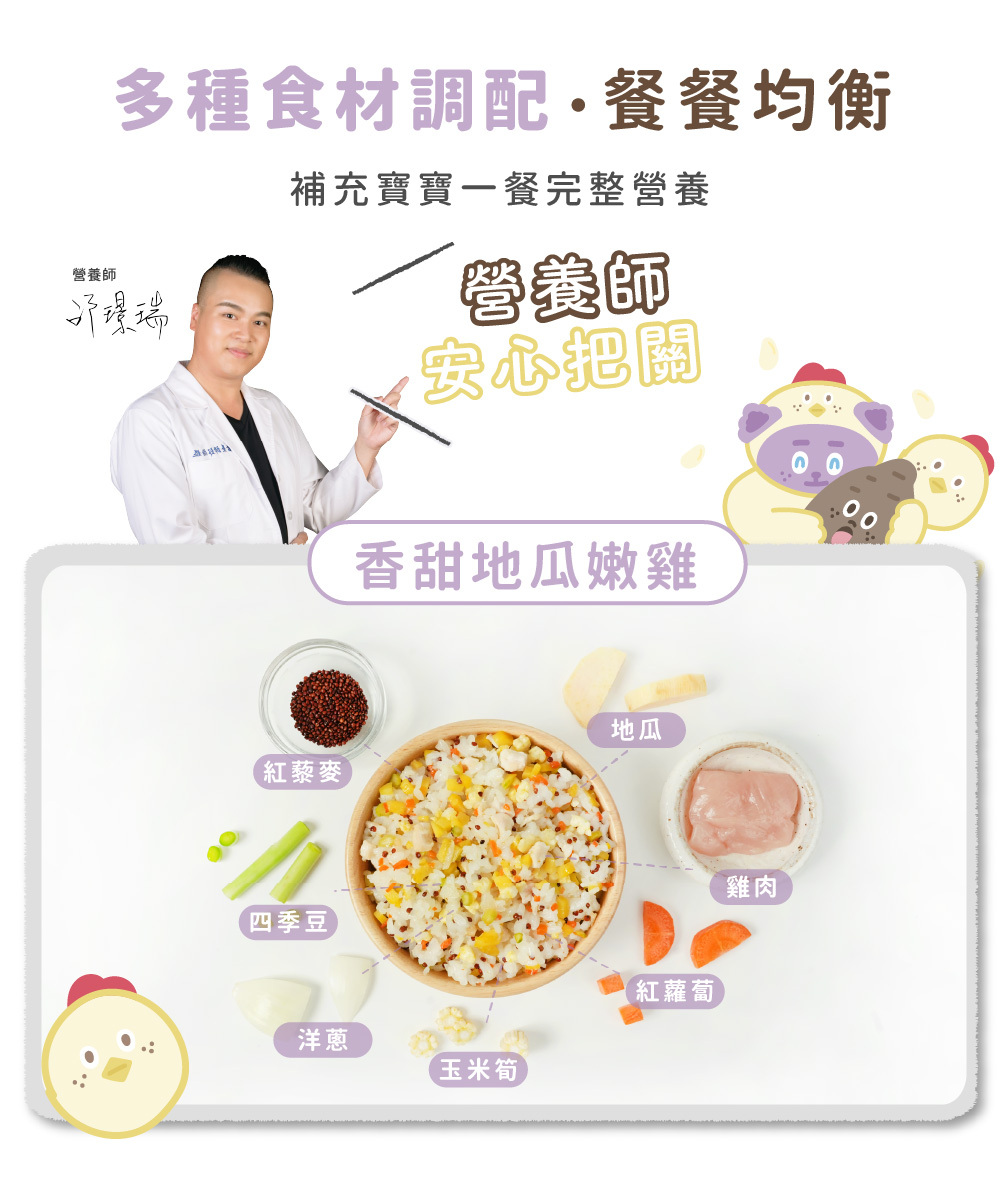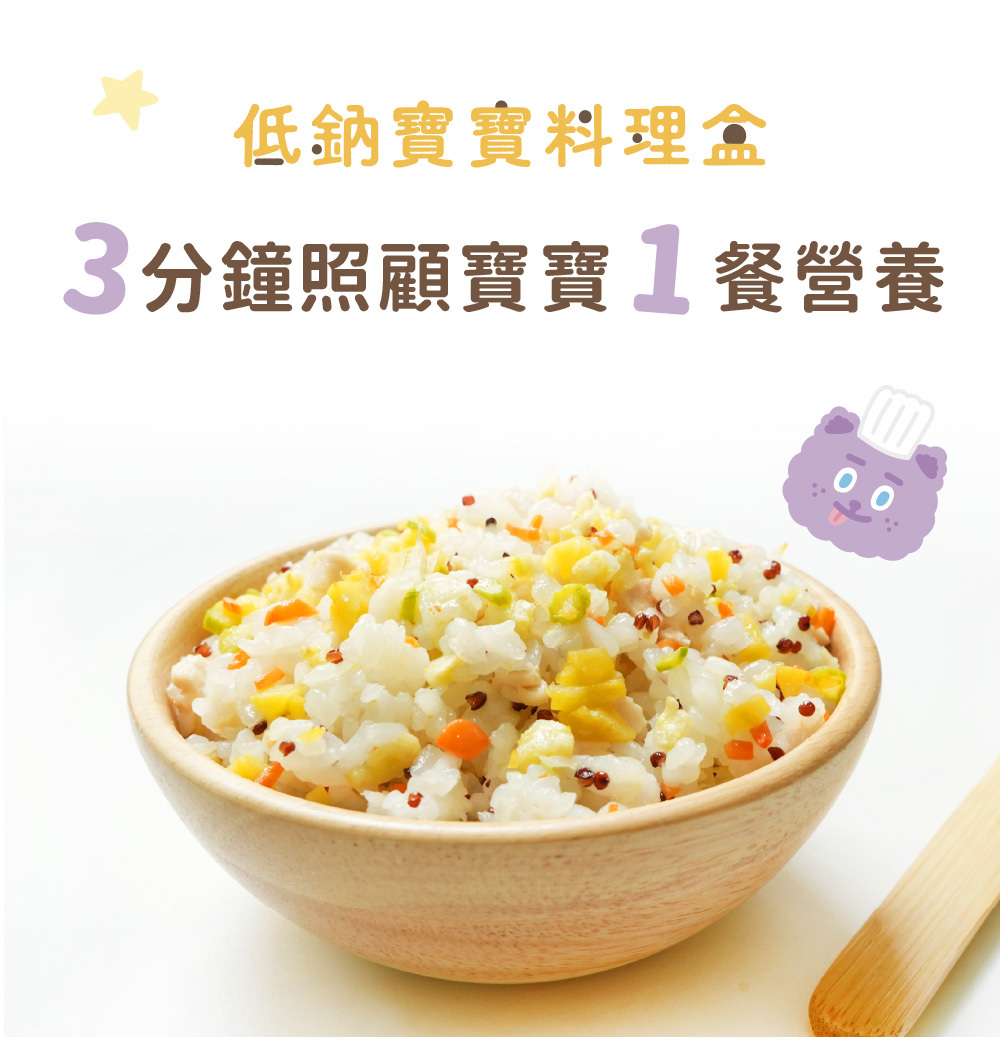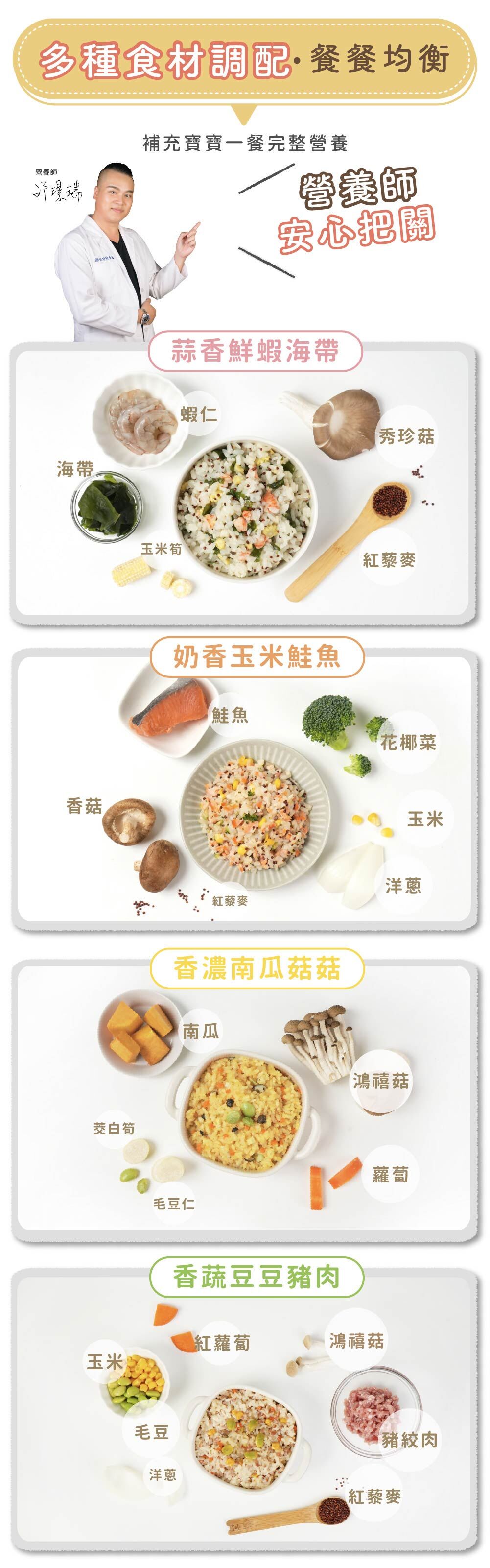 口味:香蔬豆豆豬肉、蒜香鮮蝦海帶、奶香玉米鮭魚、香濃南瓜菇菇(180g/盒)