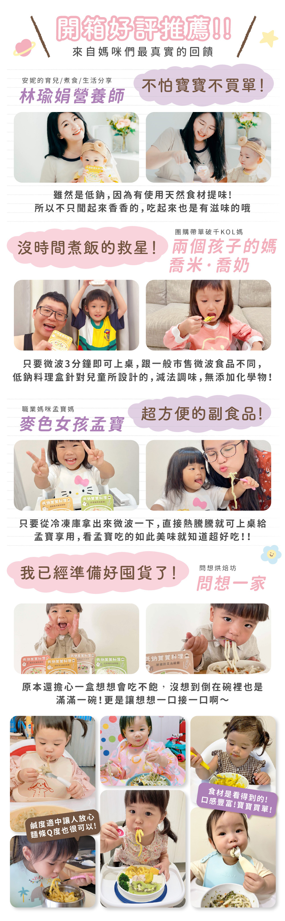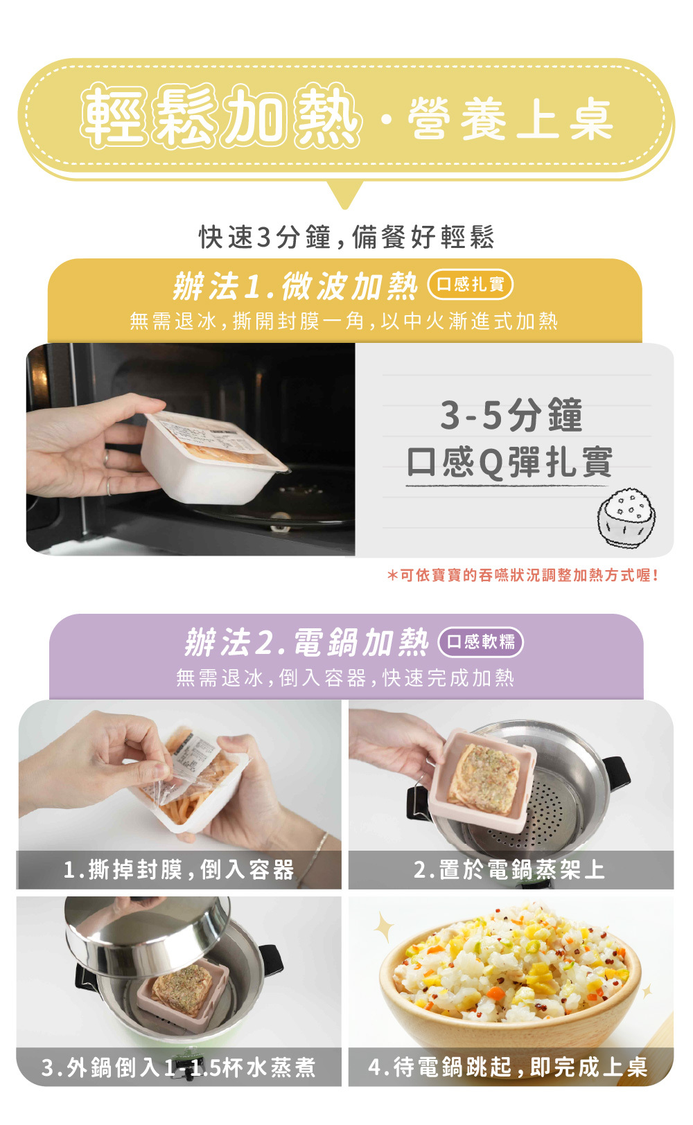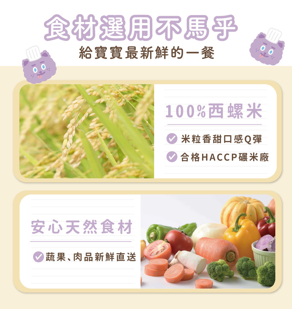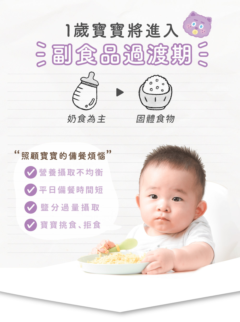 口味:香蔬豆豆豬肉、蒜香鮮蝦海帶、奶香玉米鮭魚、香濃南瓜菇菇(180g/盒)