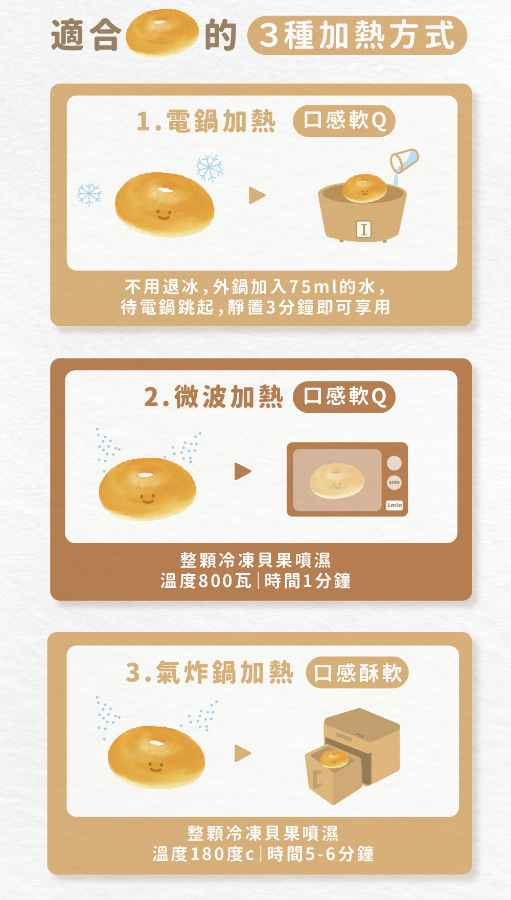 寶寶貝果無需退冰!電鍋:外鍋加入75ml的水,待電鍋跳起,靜置3分鐘即可享用:)